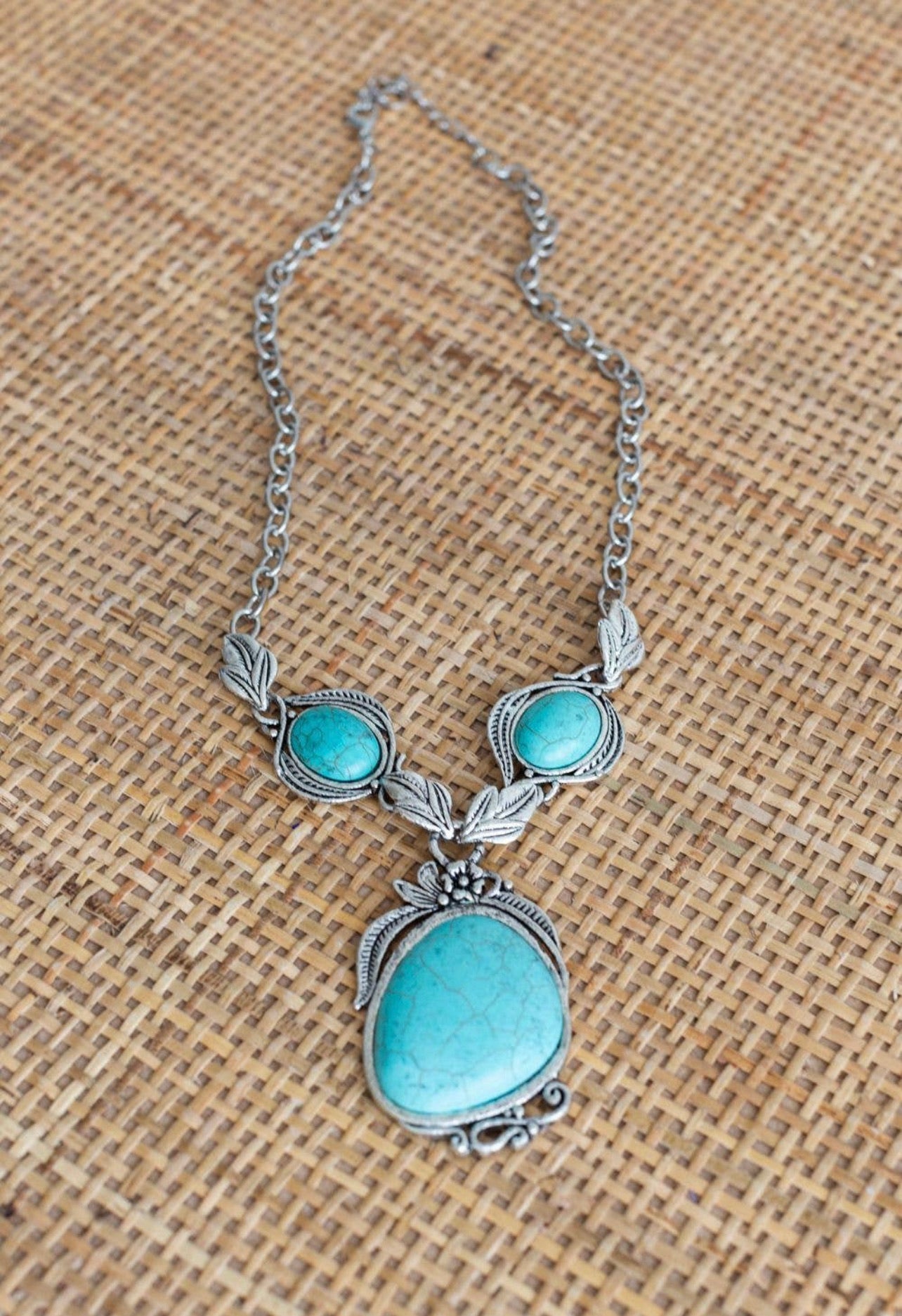 Made from handcut stones and zinc alloy this turquoise necklace completes any boho look.