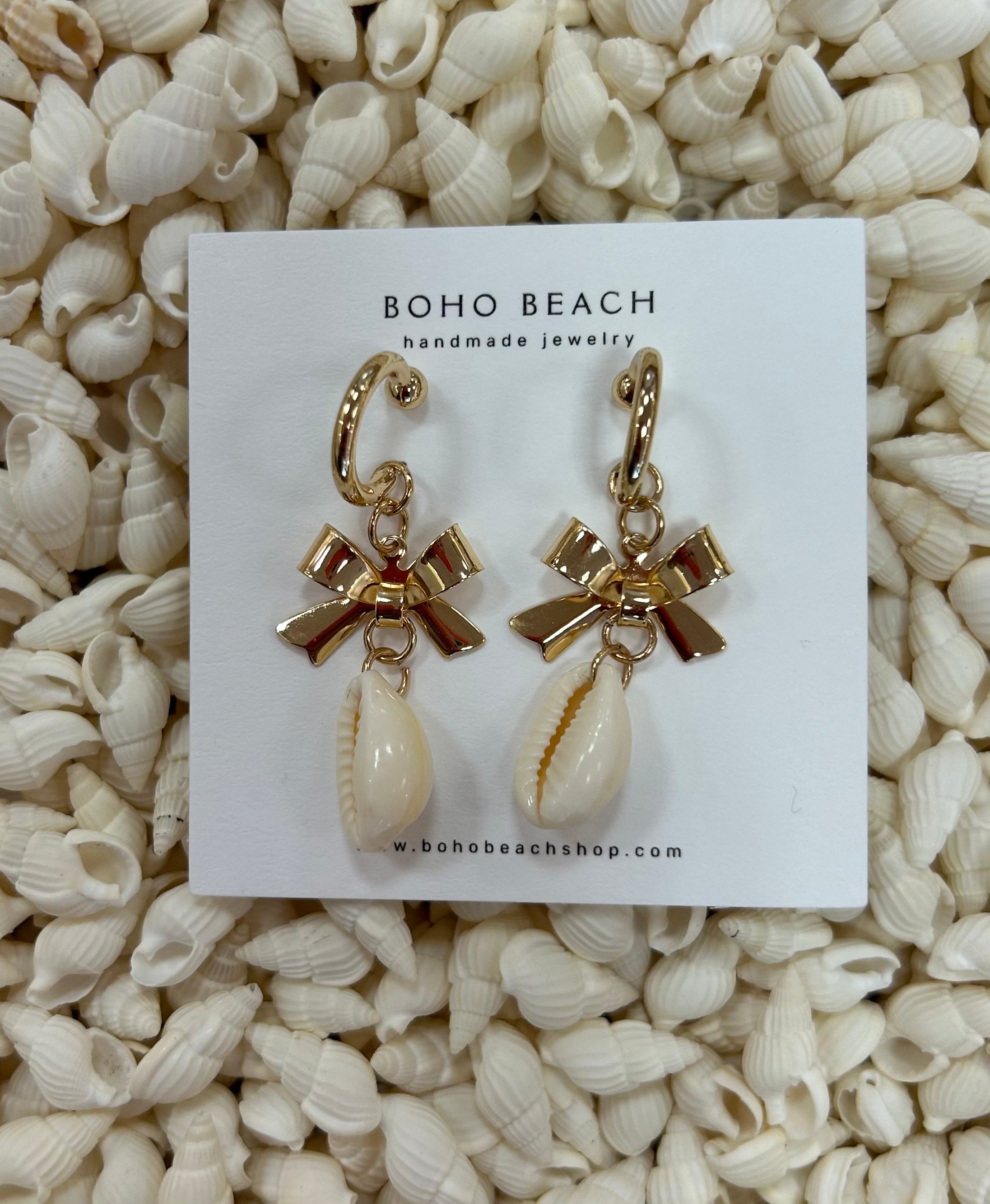 These gold earrings have a cute girly bow charm with dangling beachy puka shells