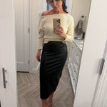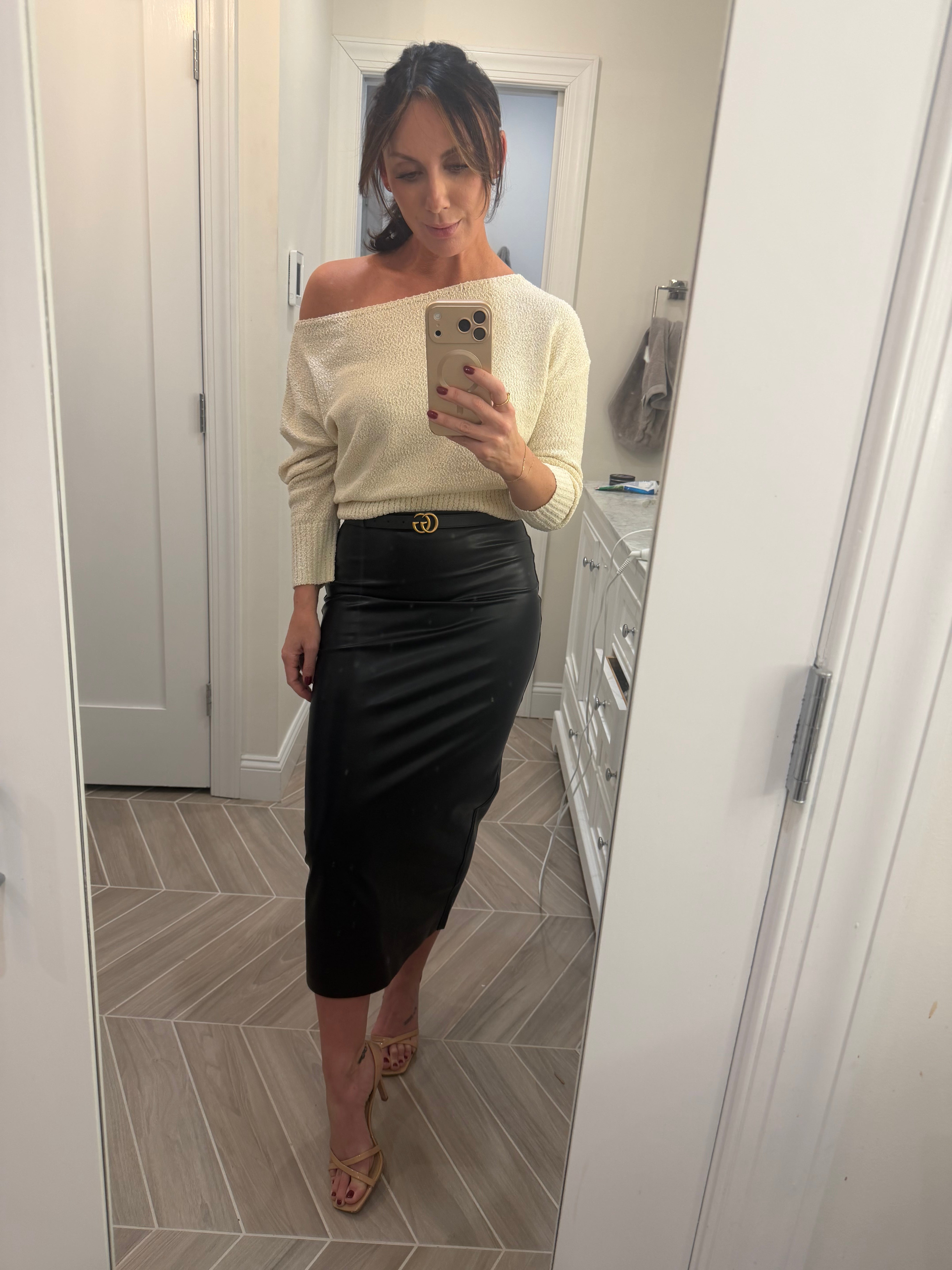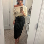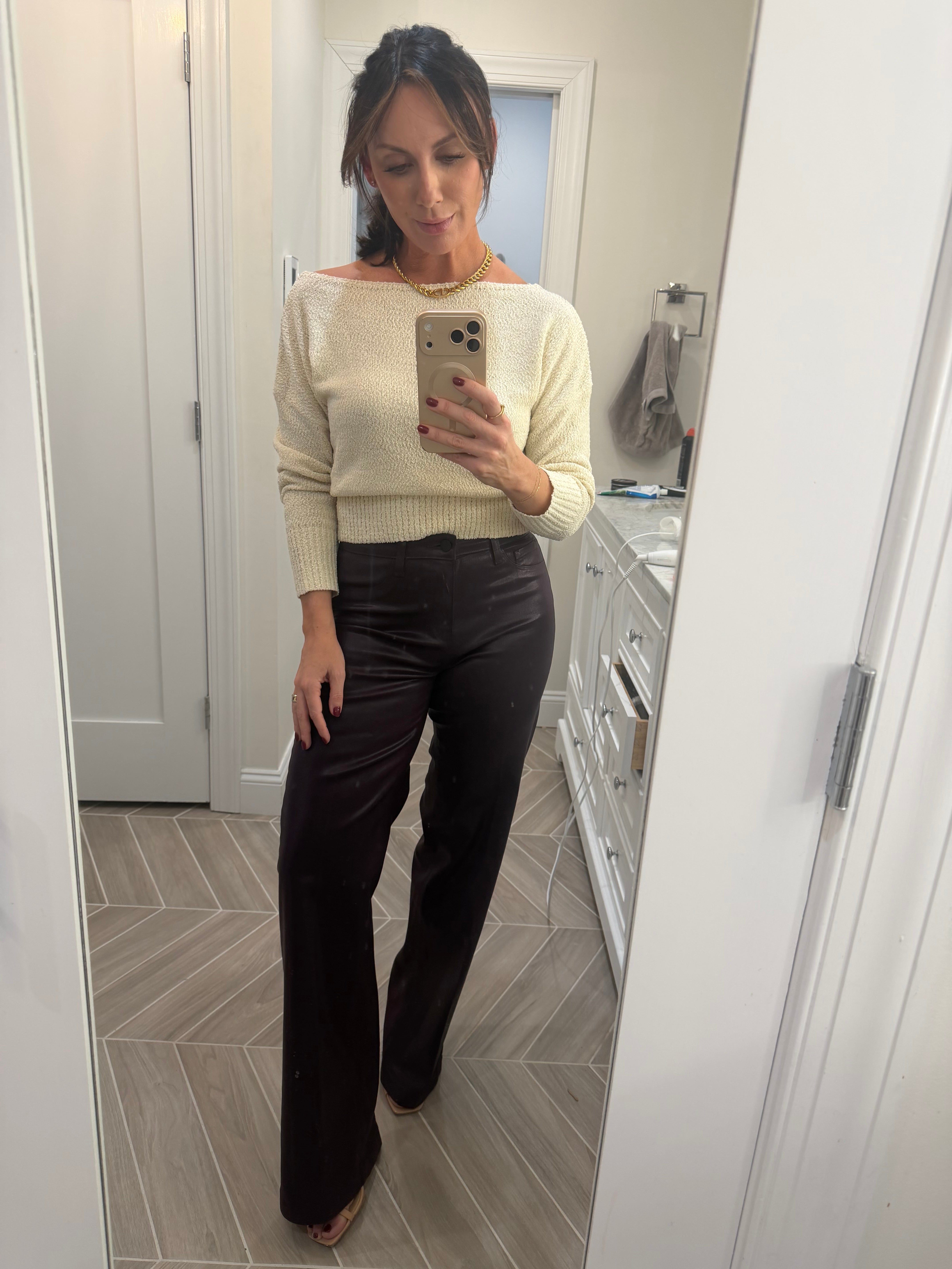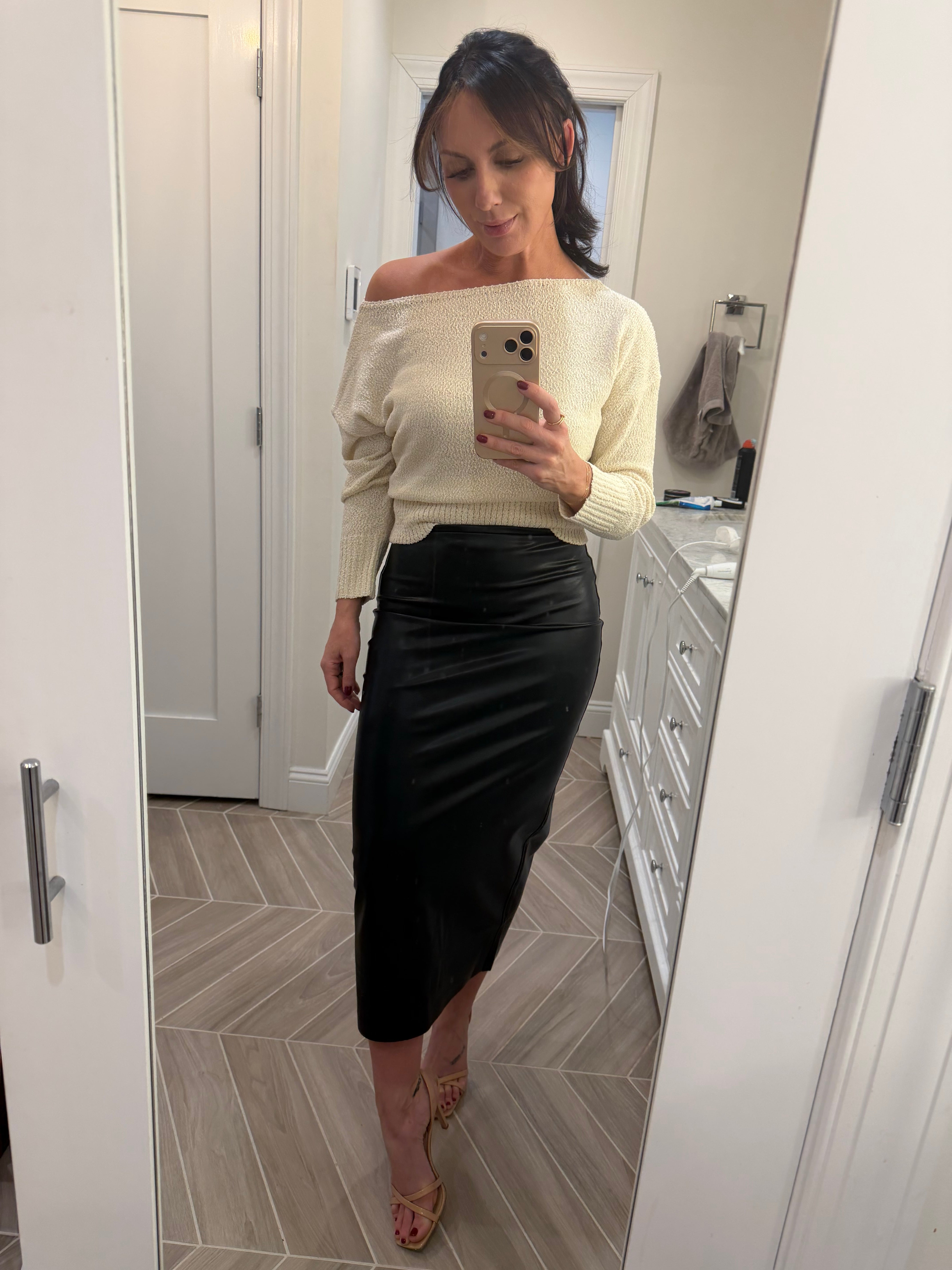 This petite beautiful cream sweater is cozy and soft and can be worn on or off shoulder style runs a little smaller. hits at waist.