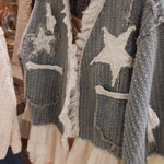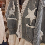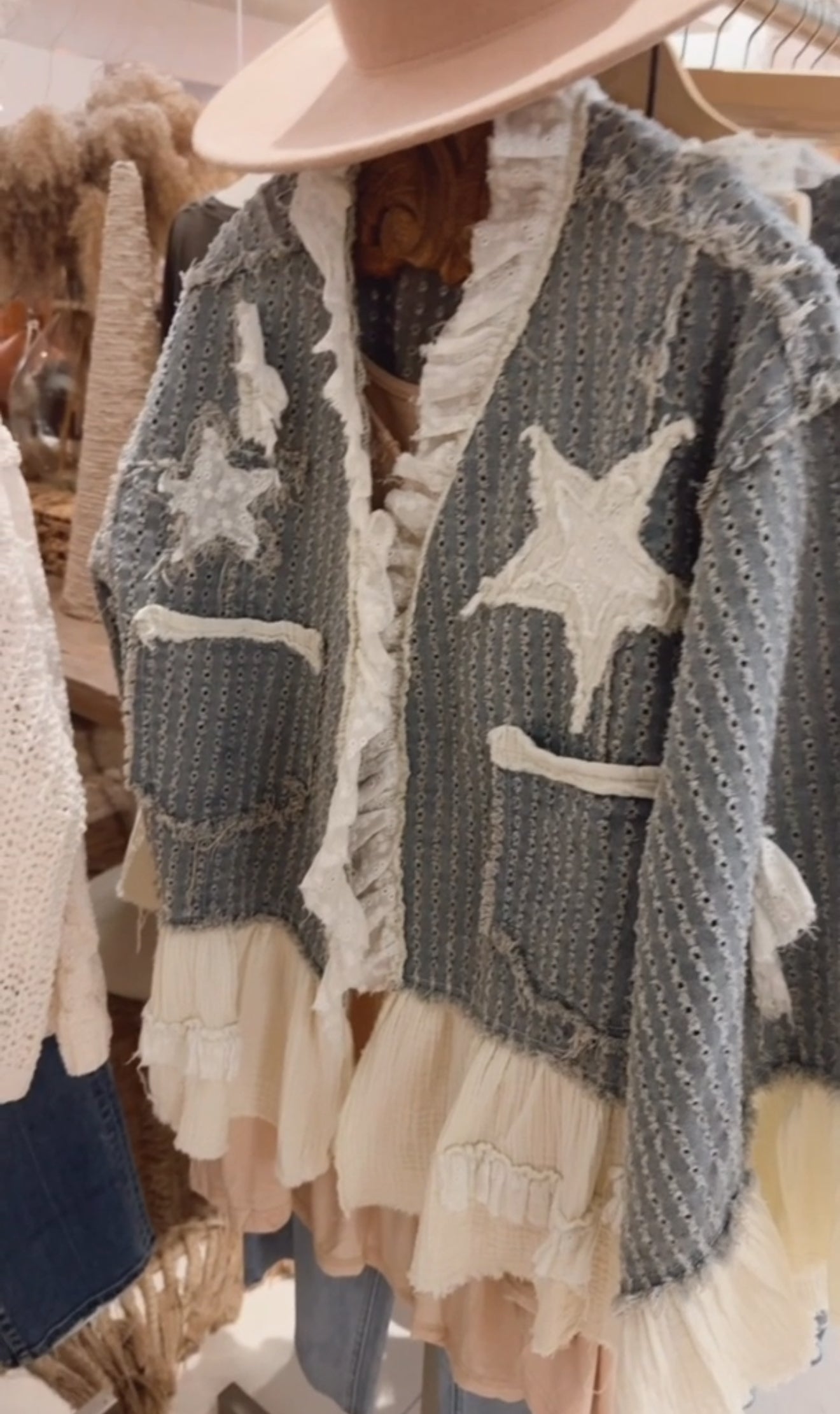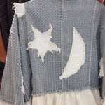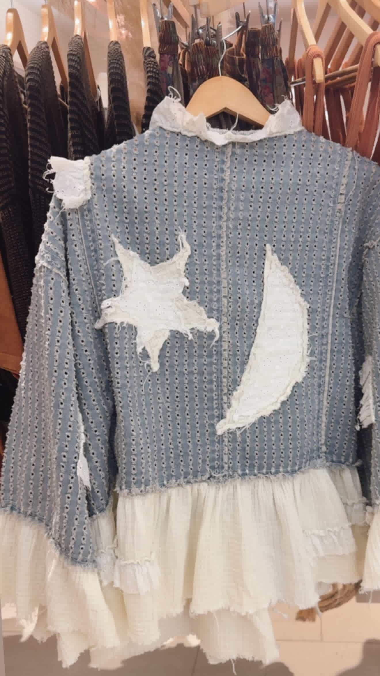 Boho blue beautiful patchwork crochet cardigan ultra soft denim jacket with stars and moon!  in gorgeous soft denim colors! Super soft! eyelet distressed trim.