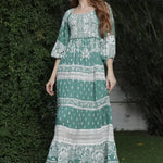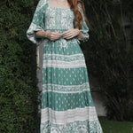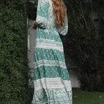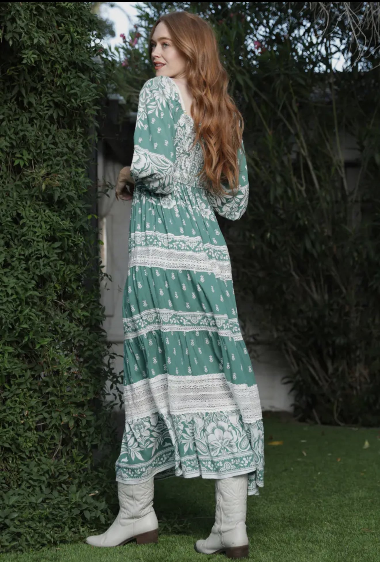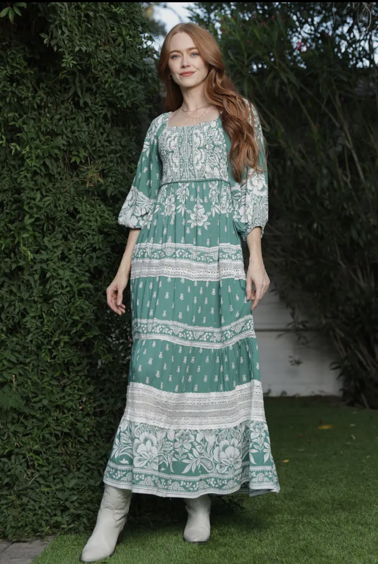 ultra soft coastal boho dress that is perfect for fall because it has like a rusty leaves color in the design: It has a unique pattern of fall florals and colors like ocean blue rust ochre and gold. snatches your waist and gives an hourglass.