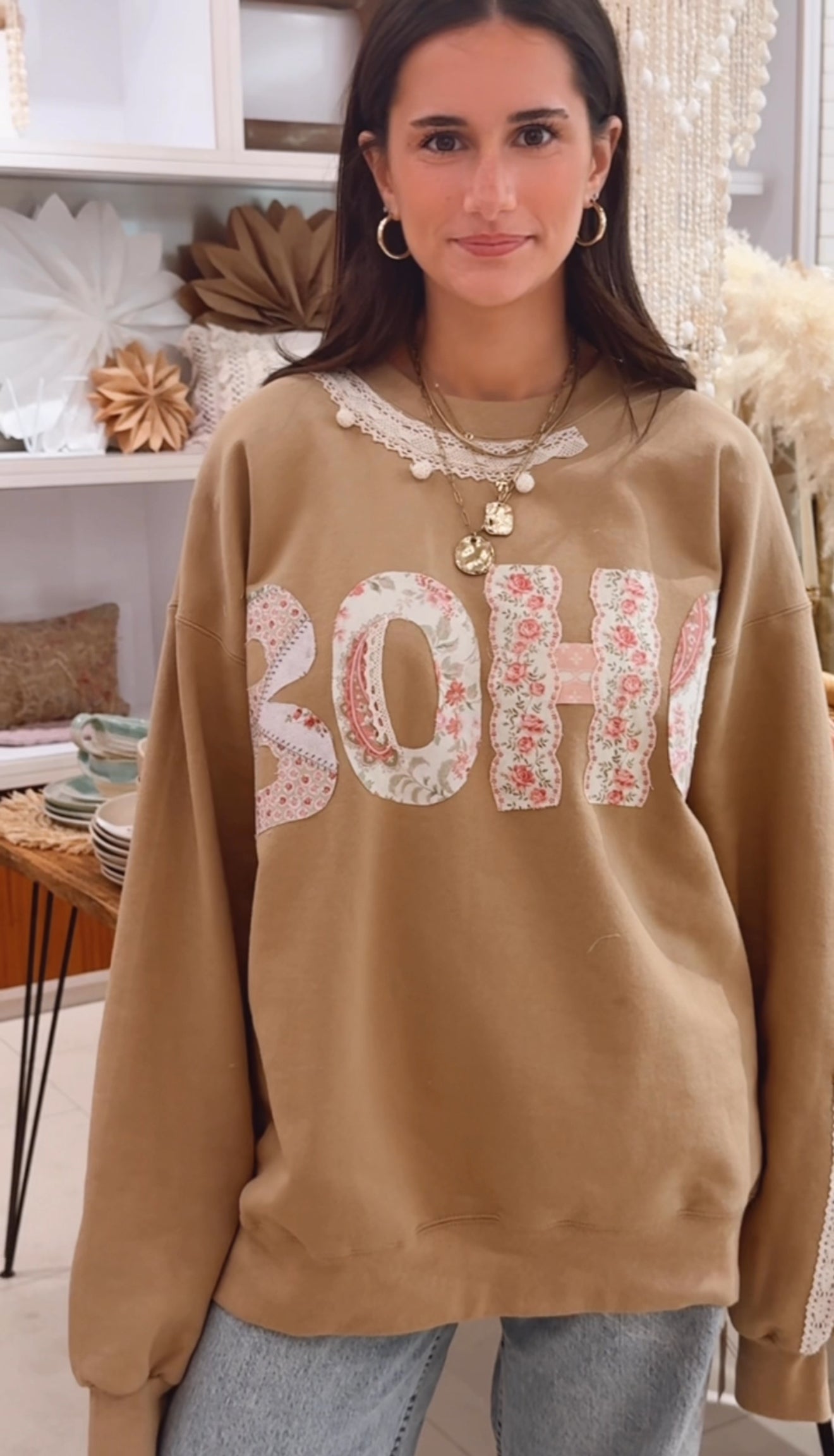 Handmade Boho sweatshirt that is custom made locally by Boho Beach. One of a kind with boho blush aesthetic. Little unfinished edges and worn in faded color is the look of this. Made from ultra soft french terry. Sand color