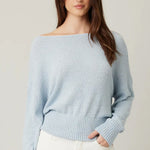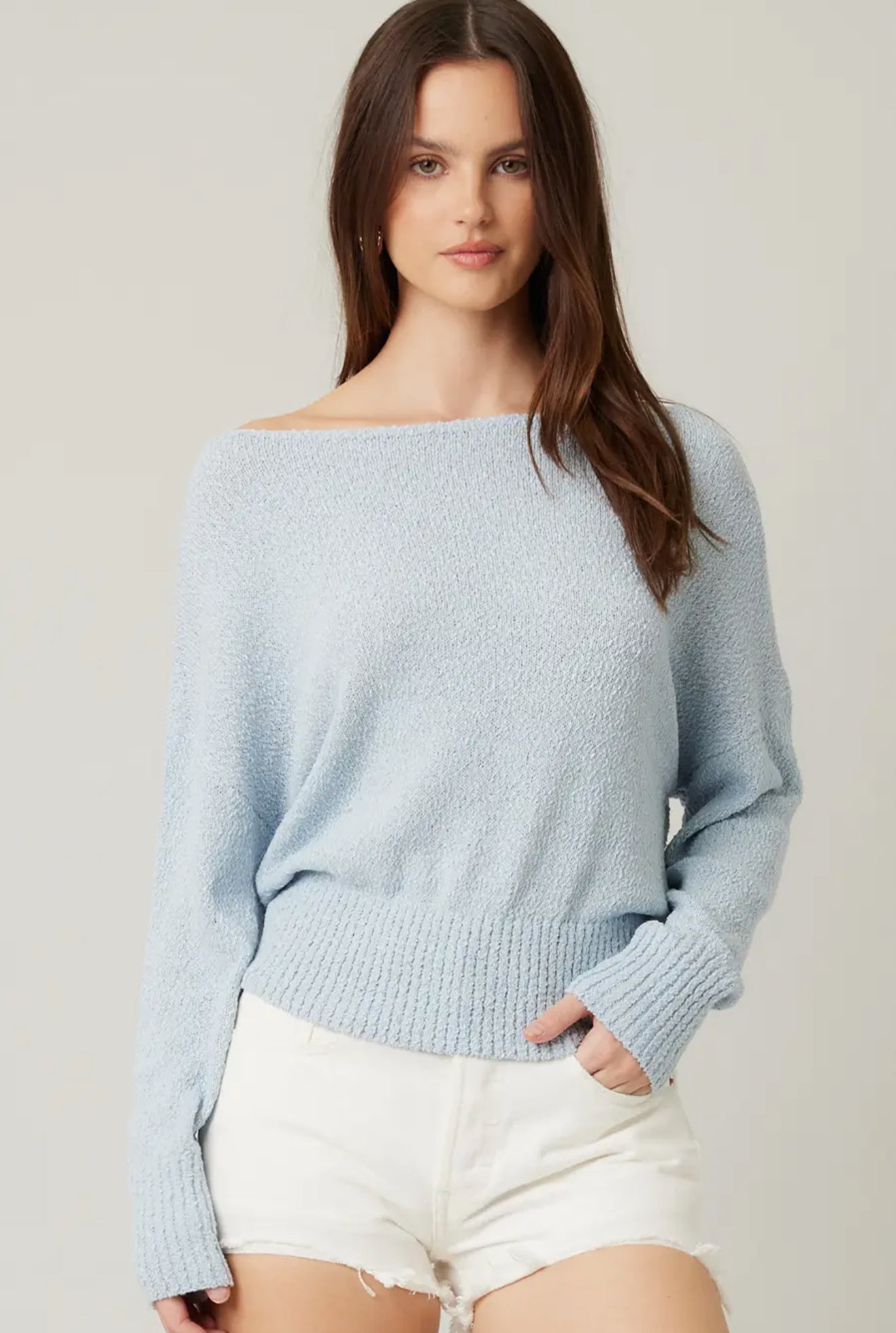 This petite beautiful sweater is cozy and soft and can be worn on or off shoulder style runs a little smaller so size up.hits at waist. We have hydrangea blue in stock.