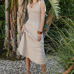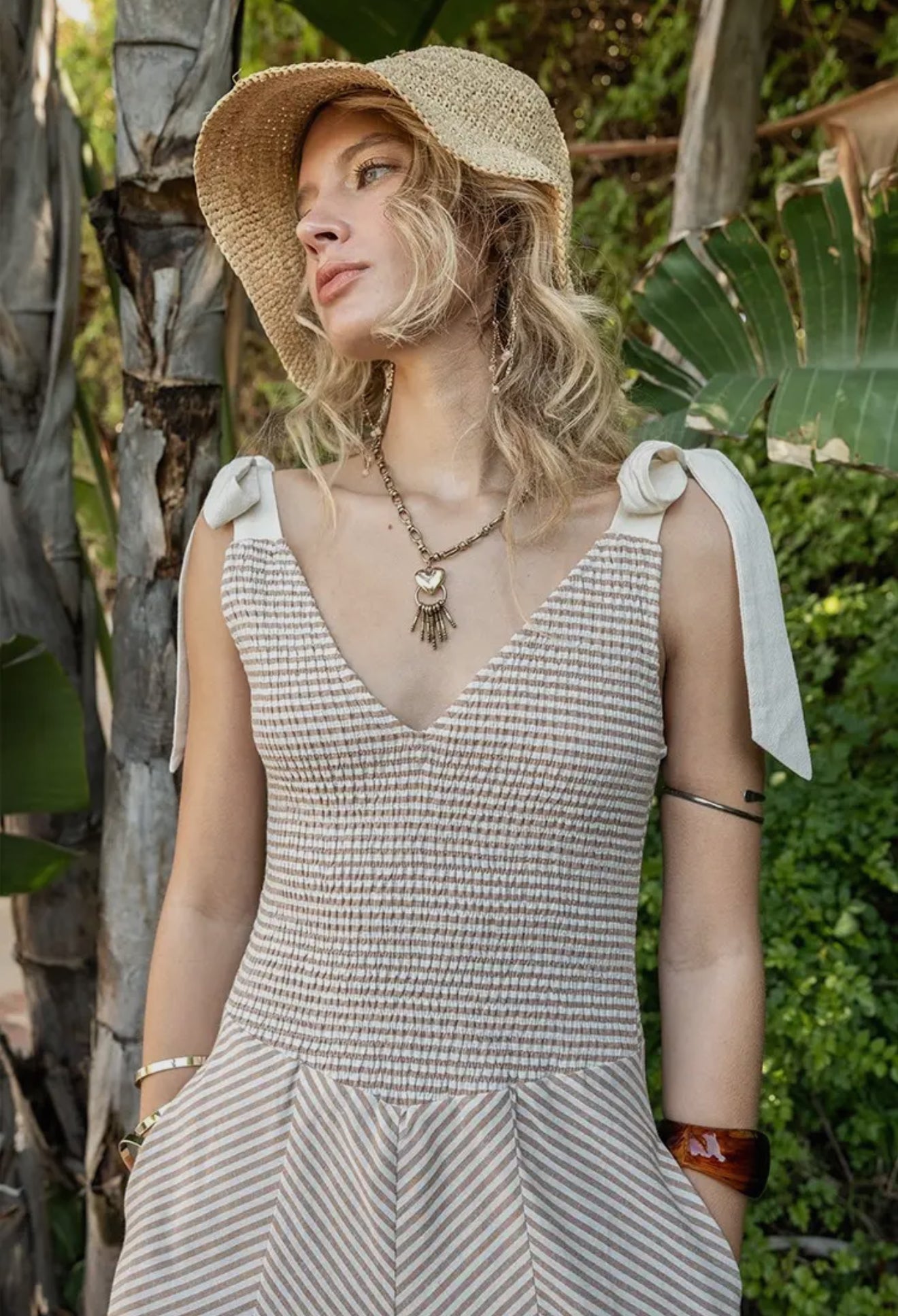 You can just see yourself on a yacht headed to Nantucket in this stunner! This gorgeous seersucker dress has the most idyllic bows at shoulders. It hits with a drop waist and has the most perfect pockets! Midi length! Runs true to size and shoulder straps are adjustable!
